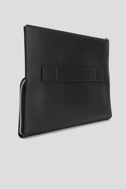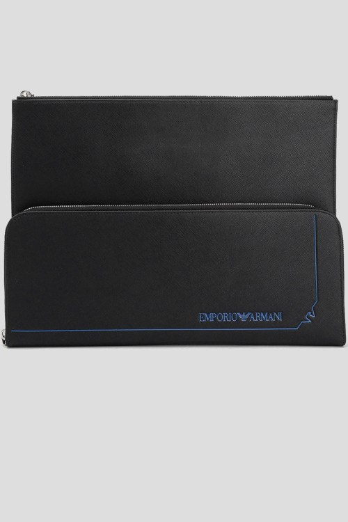Детали: Мужская черная кожаная сумка-планшет для документов от Emporio Armani (Эмпорио Армани). Контрастное тиснение логотипа, застежка-молния, внешний карман на молнии, одно отделение