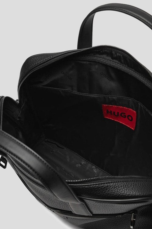 Детали: Мужская черная сумка для ноутбука из экокожи от Hugo by Hugo Boss (Хуго бай Хуго Босс). Одно отделение, застежка на молнию, внутренние карманы, две верхние ручки, внешний карман на молнии, патч-лого, регулируемый плечевой ремень. Размер: 37 x 30 x 7.5 см, максимальная длина ремня: 161 см