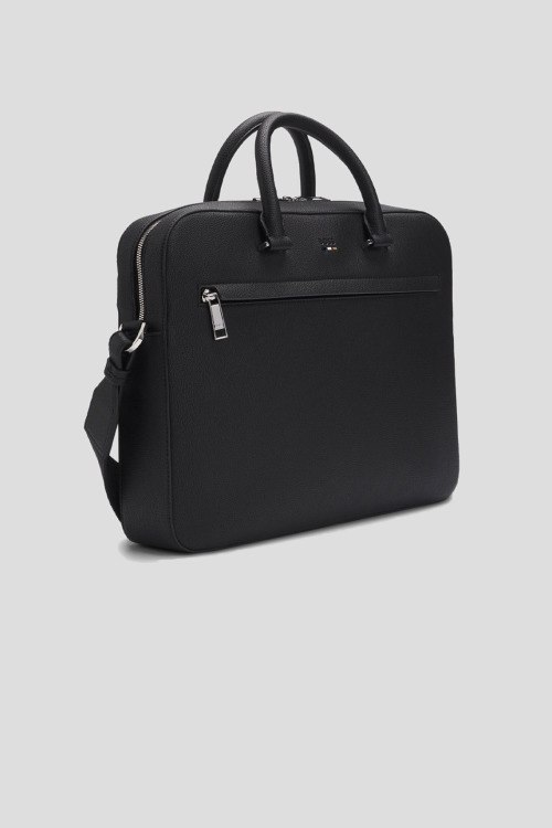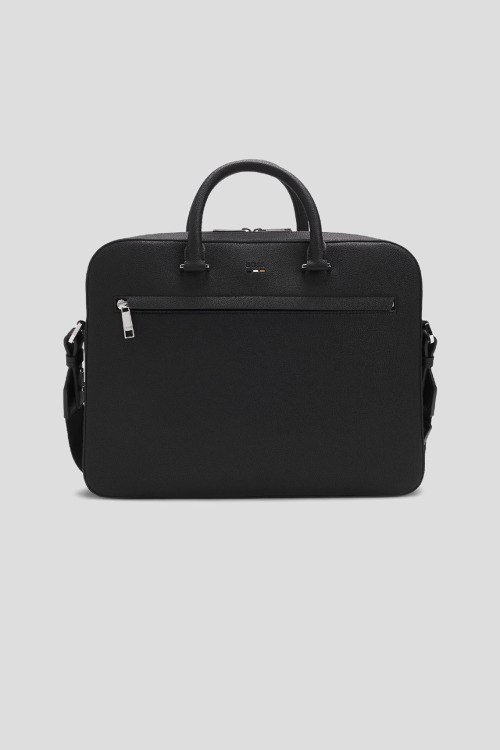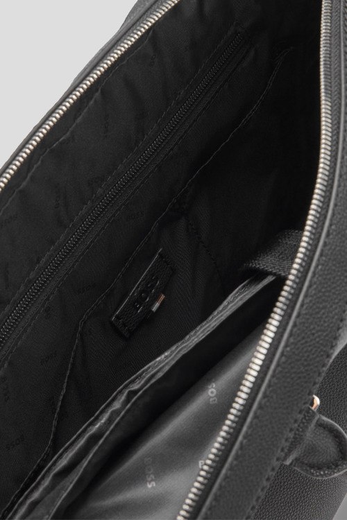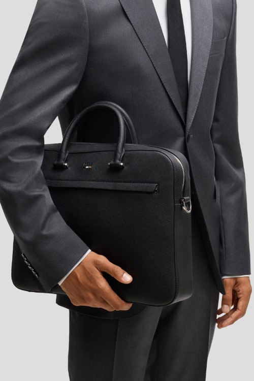 Детали: Мужская черная сумка для ноутбука из экокожи Ray от Hugo Boss (Хуго Босс). Модель из зернистой кожи, тиснение логотипа, внешний карман на молнии, две верхние ручки, съемный плечевой ремень, застежка-молния, одно отделение. Размеры: 39 x 29.5 x 7 см
