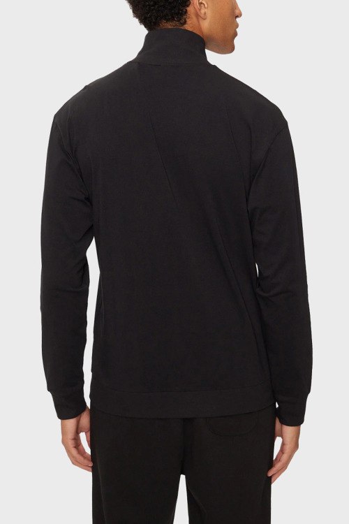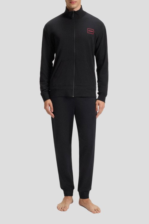 Детали: Мужской черный хлопковый домашний костюм от Hugo by Hugo Boss (Хуго бай Хуго Босс). Кофта: логотип на груди, высокий воротник, боковые карманы, застежка-молния, классическая длина. Брюки: эластичный пояс, логотип, боковые карманы, трикотажные манжеты, полная длина
