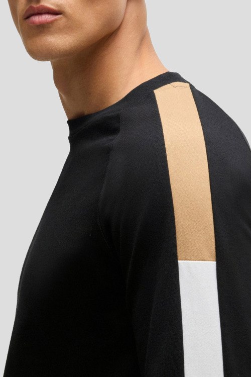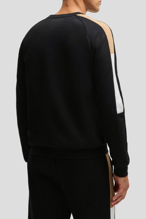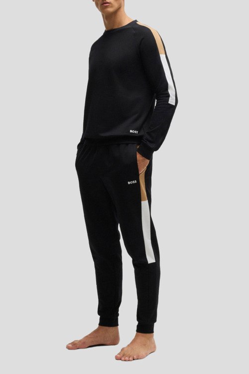 Детали: Мужской черный хлопковый домашний костюм Balance от Hugo Boss (Хуго Босс). Свитшот: бело-бежевые лампасы, принт с логотипом, круглый вырез горловины, классическая длина. Брюки: эластичный пояс, бело-бежевые лампасы, принт с логотипом, боковые карманы, трикотажные манжеты, полная длина