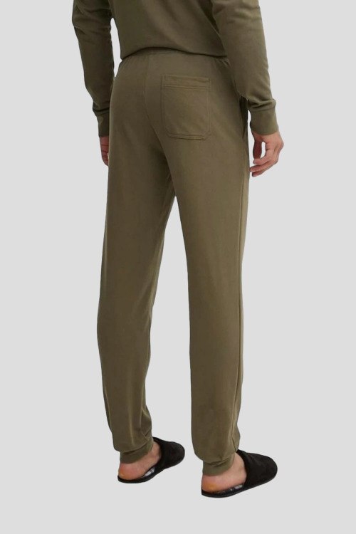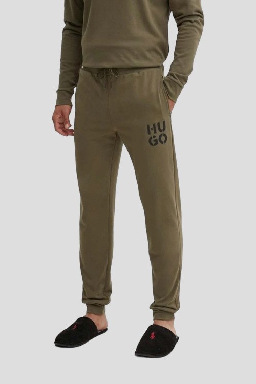 Детали: Мужские хлопковые домашние брюки цвета хаки SprayLogo от Hugo by Hugo Boss (Хуго бай Хуго Босс). Эластичный пояс на завязках, боковые карманы, принт логотипа, трикотажные манжеты, полная длина
