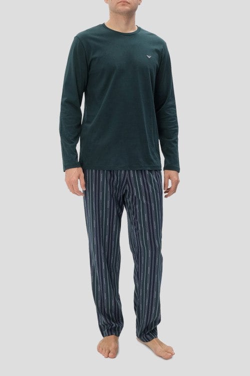 Детали: Мужская зеленая хлопковая пижама от Emporio Armani (Эмпорио Армани). Лонгслив: логотип на груди, круглый вырез горловины, классическая длина. Брюки: эластичный пояс, принт в полоску, боковые карманы, полная длина