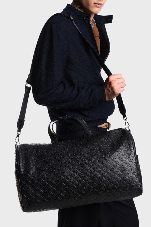 Детали: Мужская черная кожаная дорожная сумка от Emporio Armani (Эмпорио Армани). Тиснение монограммы по всей поверхности, нашивка с логотипом, два боковых кармана, две круглые ручки, съемный плечевой ремень, застежка-молния, одно отделение. Размеры: 50 x 28 x 23 см