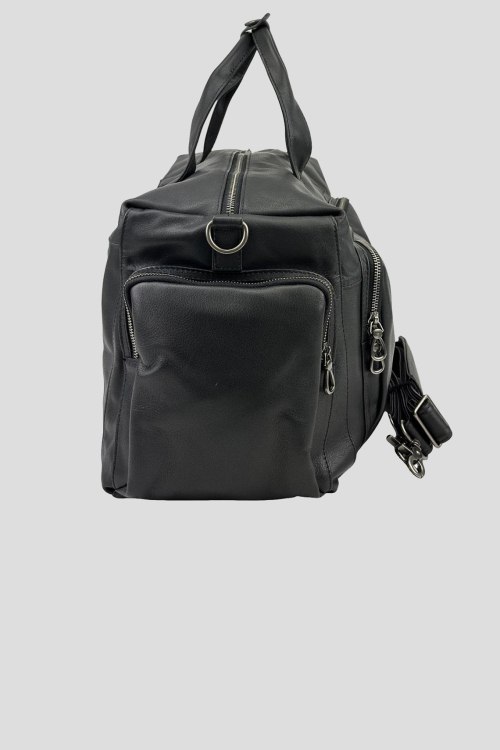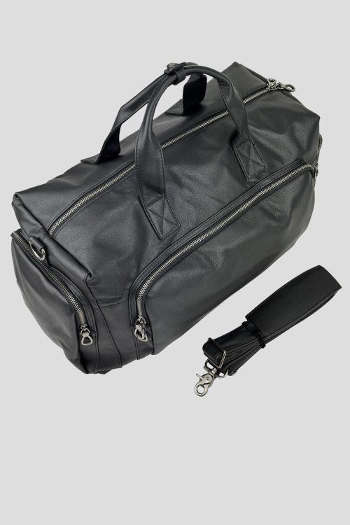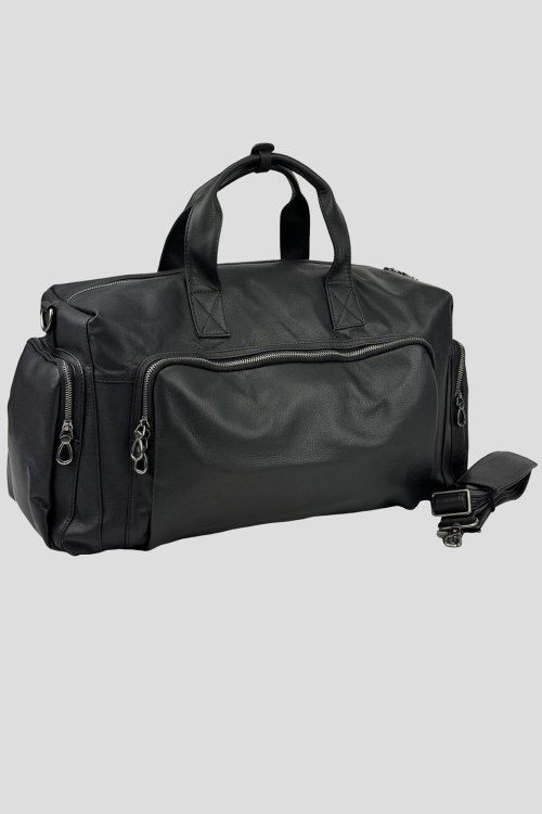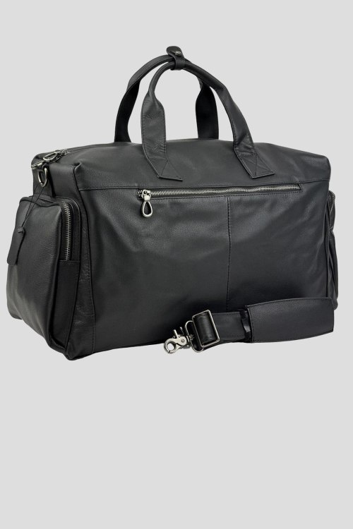 Детали: Женская черная дорожная сумка из натуральной кожи от Tiding Bag (Тайдинг Бег). Одно отделение, внешние карманы на молнии, две верхние ручки, внутренние карманы, съмный плечевой ремень. Измерения: 47 x 27 x 19 см