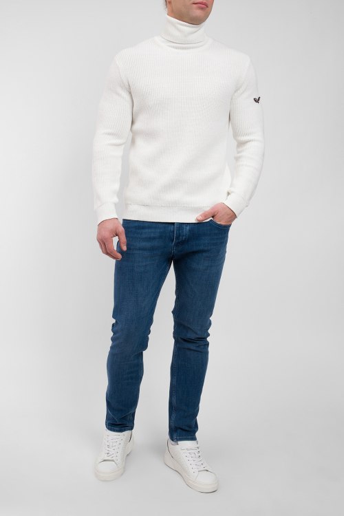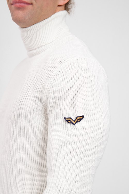 Детали: Мужской белый гольф из хлопка и кашемира от Armata di Mare (Армата ди Маре). Высокий воротник-стойка с отворотом, классическая длина, длинные рукава, трикотажная резинка на манжетах и по низу изделия, патч-лого на рукаве
