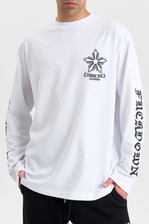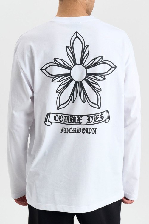 Детали: Мужской белый хлопковый лонгслив от Comme des Fuckdown (Камм дес Факдаун). Логотип на груди, спине и на рукавах, круглый вырез горловины, длинный рукав, классическая длина. Параметры модели: 97 см - 78 см - 96 см. Рост - 188 см.- Размер на фото - L