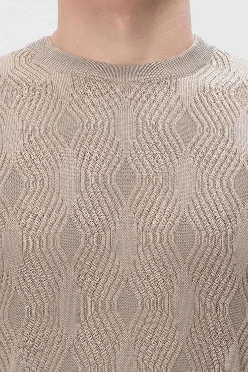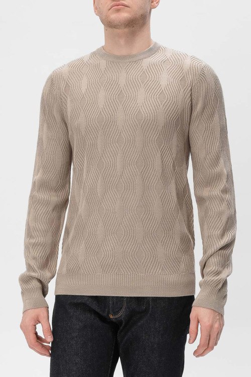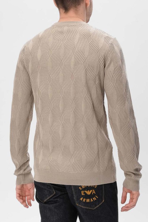 Детали: Мужской бежевый джемпер из акрила и шерсти от Emporio Armani (Эмпорио Армани). Ребристый узор по всей поверхности, круглый вырез горловины, классическая длина