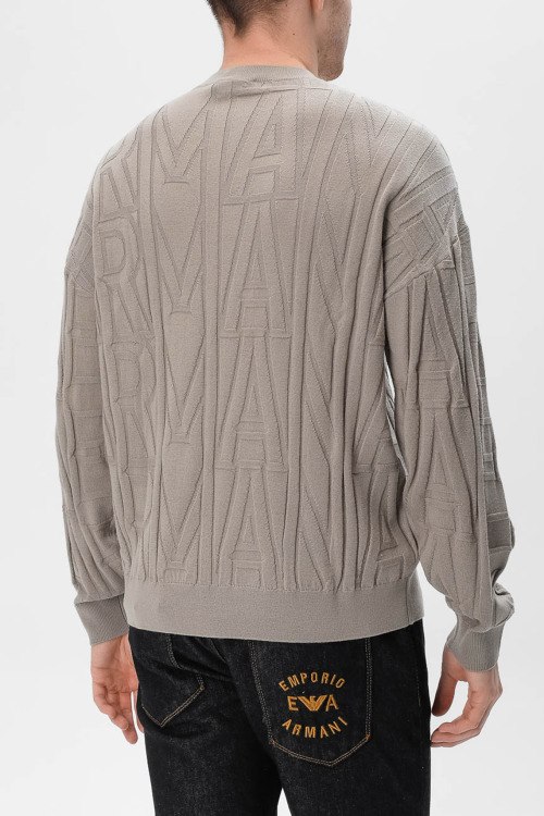 Детали: Мужской бежевый шерстяной джемпер от Emporio Armani (Эмпорио Армани). Логотип по всей поверхности, круглый вырез горловины, классическая длина, манжеты и нижний край в рубчик