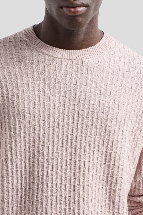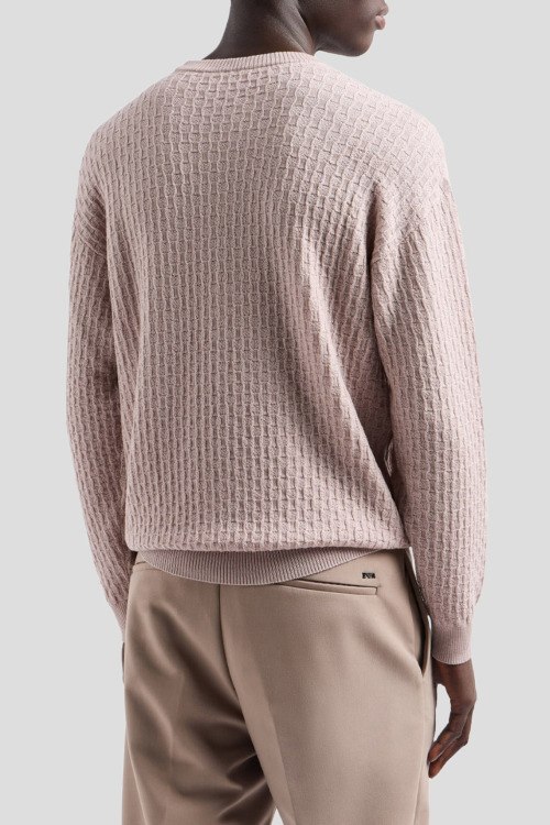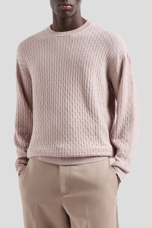 Детали: Мужской пудровый джемпер из шерсти от Emporio Armani (Эмпорио Армани). Фактурная вязка, круглый вырез горловины, длинные рукава. трикотажная резинка на манжетах и по низу изделия