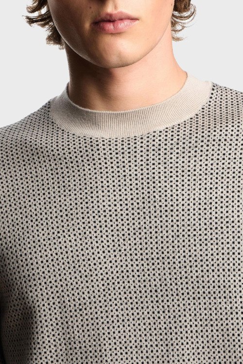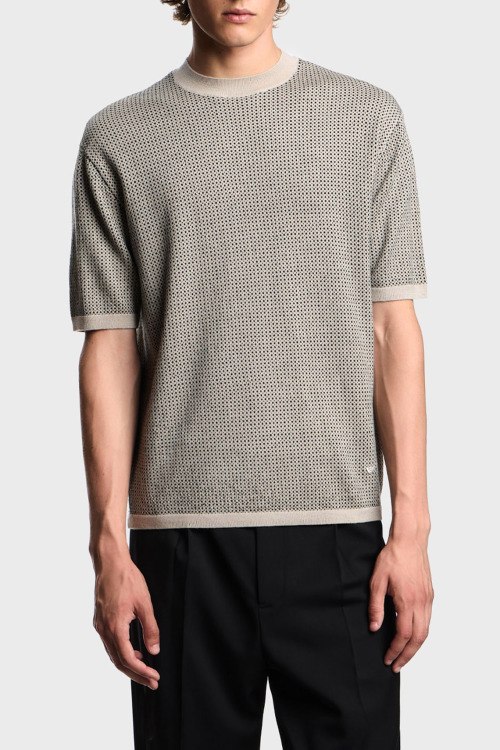 Детали: Мужской бежевый шерстной джемпер от Emporio Armani (Эмпорио Армани). Мелкий узор по всей поверхности, круглый вырез горловины, короткий рукав, классическая длина