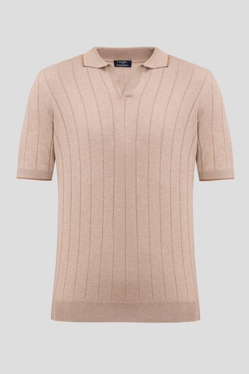 Детали: Мужской бежевый шелковый джемпер-поло от Barba Napoli (Барба Наполи). Классический воротник, V-образный вырез горловины, короткие рукава, трикотажная резинка на манжетах и по низу изделия