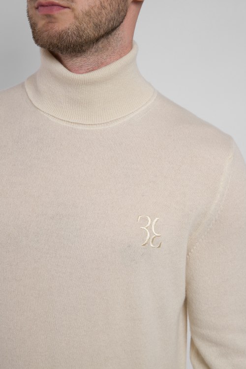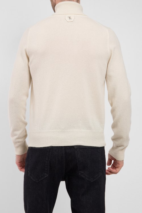 Мужской кремовый гольф из кашемира от Billionaire (Биллионер). Классическая длина, высокий воротник-стойка с отворотом, вышитый логотип бренда на груди, патч-лого на спине, длинные рукава, трикотажная резинка на манжетах и по низу изделия.