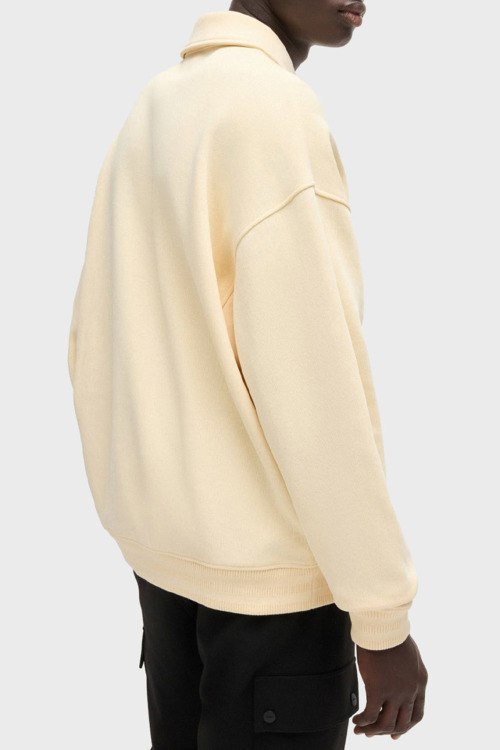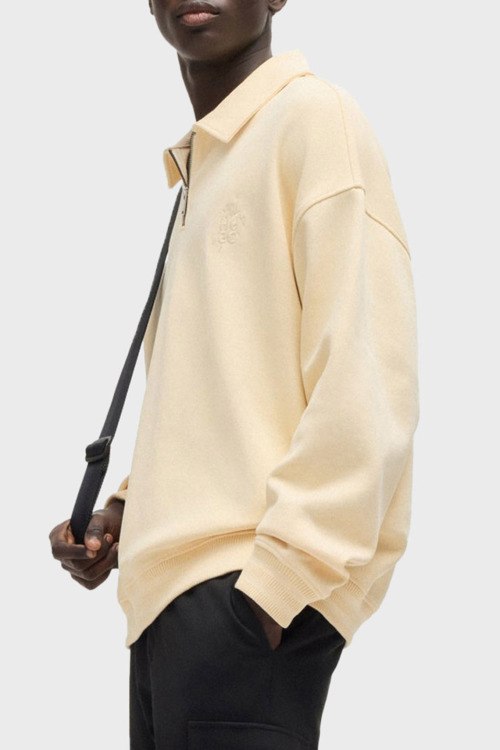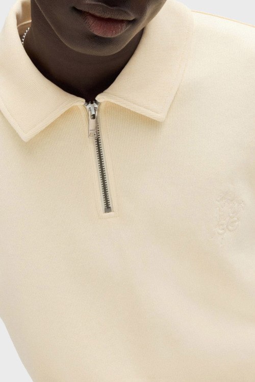 Детали: Мужской бежевый джемпер-поло из хлопка и полиэстера от Hugo by Hugo Boss (Хуго бай Хуго Босс). Классический воротник, горловина на молнии, длинные рукава, манжеты и низ изделия в рубчик