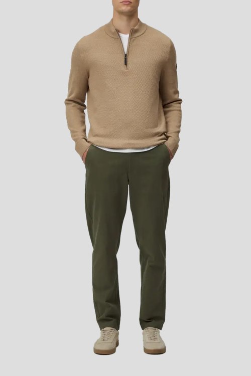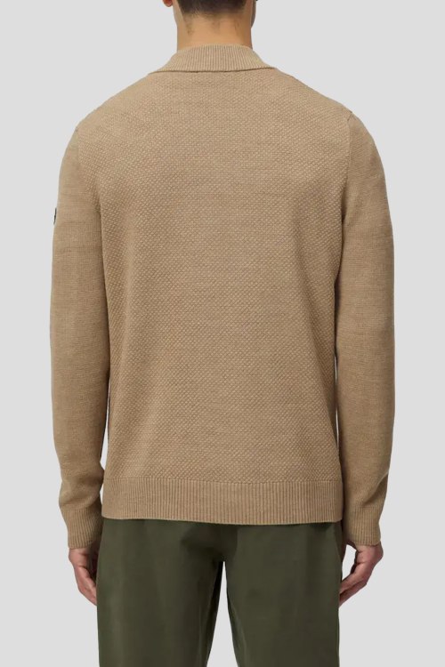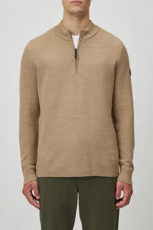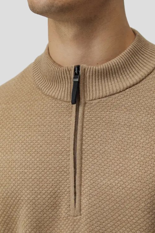 Детали: Мужской бежевый джемпер из хлопка и шерсти от Maerz (Маерз). Высокий воротник-стойка, горловина на молнии, длинные рукава, трикотажная резинка на манжетах и по низу изделия