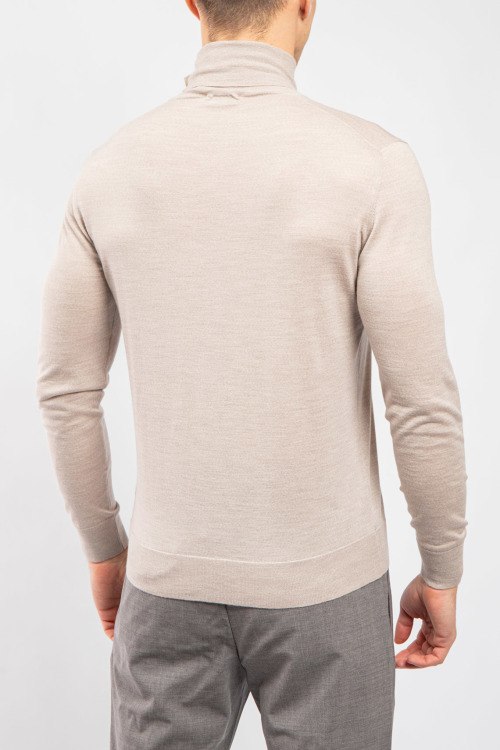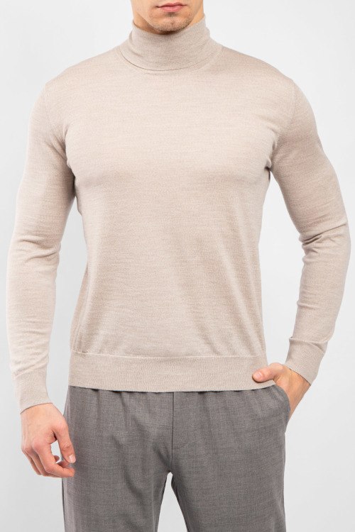 Детали: Мужской бежевый гольф из шерсти и шелка от Panicale Cashmere (Паникале Кашемир). Высокая горловина, классическая длина, ребристые манжеты и нижний край. Размер вещи на фото: 50