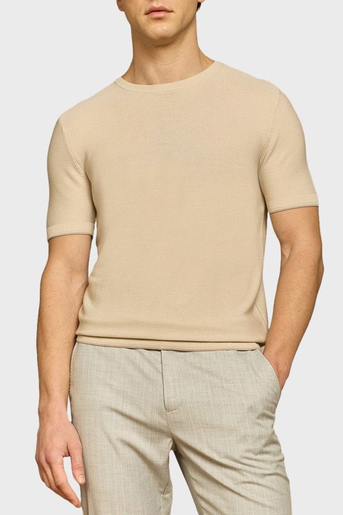 Детали: Мужской бежевый джемпер из хлопка от Paul Taylor (Пол Тейлор). Классическая длина, круглый вырез горловины, короткие рукава, эластичная резинка на манжетах