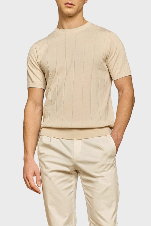 Детали: Мужской бежевый джемпер из хлопка от Paul Taylor (Пол Тейлор). Классическая длина, круглый вырез горловины, короткие рукава, эластичная резинка на манжетах