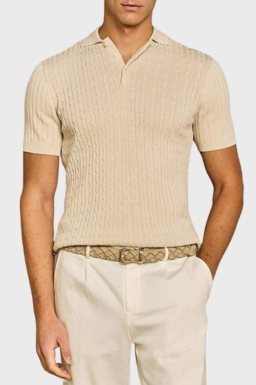 Детали: Мужской бежевый джемпер-поло из хлопка от Paul Taylor (Пол Тейлор). Классический воротник, горловина на пуговицах, короткие рукава, фактурная вязка