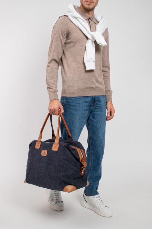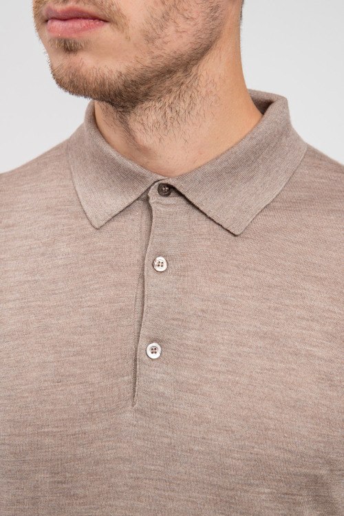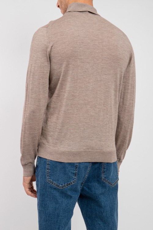 Мужской бежевый джемпер-поло из кашемира и шерсти от Scabal (Скабал). Отложной воротник, застежка на пуговицы, классическая длина, манжеты и нижний край в рубчик.