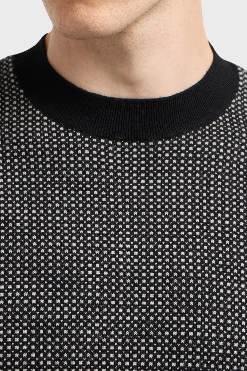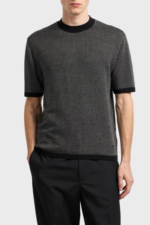 Детали: Мужской черный шерстяной джемпер от Emporio Armani (Эмпорио Армани). Шеометричнский узор по всей поверхности, круглый вырез горловины, короткий рукав, классическая длина