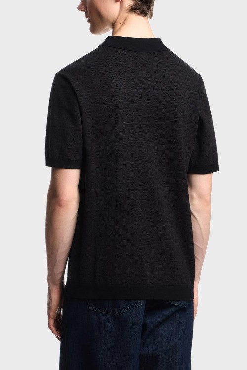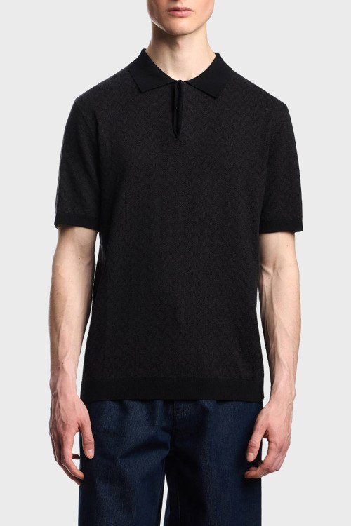 Детали: Мужской черный хлопковый джемпер-поло от Emporio Armani (Эмпорио Армани). Модель с примесью кашемира, геометрический узор, отложной воротник, застежка на две пуговицы, короткий рукав, классическая длина