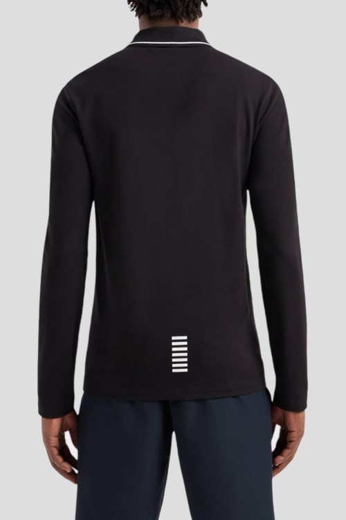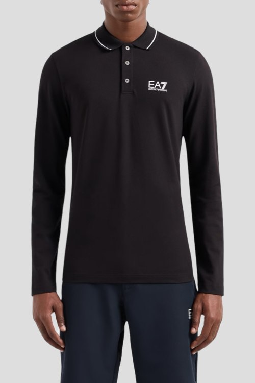 Детали: Мужской черный хлопковый джемпер-поло Core Identity от EA7 Emporio Armani (ЕА7 Эмпорио Армани). Логотип на груди, отложной воротник, застежка на три пуговицы, классическая длина