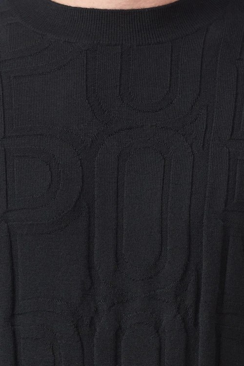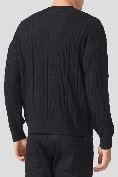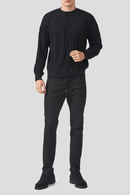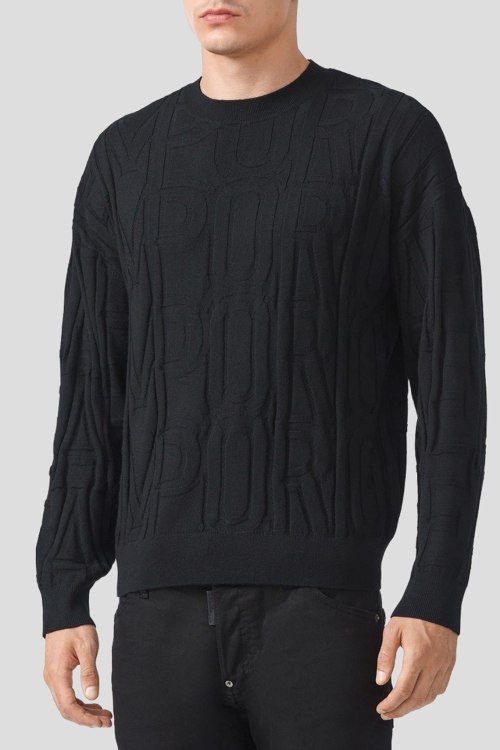 Детали: Мужской черный шерстяной джемпер от Emporio Armani (Эмпорио Армани). Логотип по всей поверхности, круглый вырез горловины, классическая длина, ребристые манжеты и нижний край