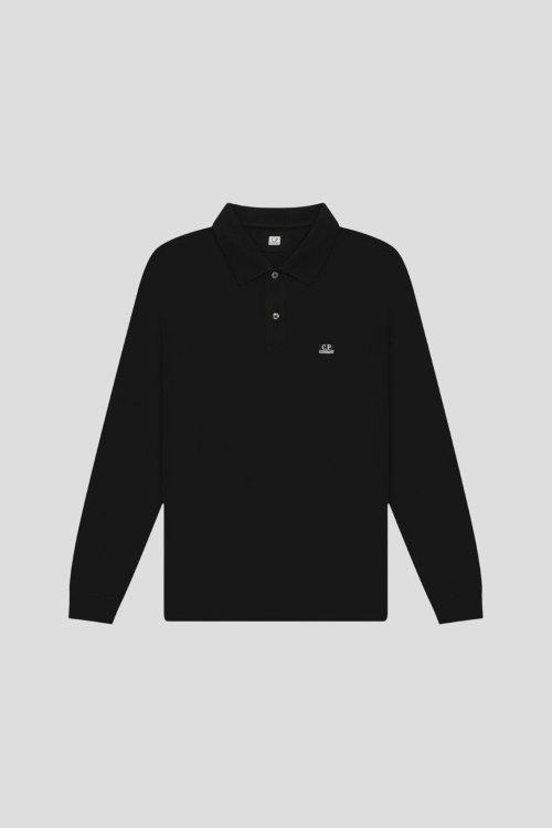 Детали: Мужской черный хлопковый джемпер-поло от C.P. Company (СиПи Компани). Логотип на груди, отложной воротник, застежка на две пуговицы, классическая длина, трикотажные манжеты и нижний край