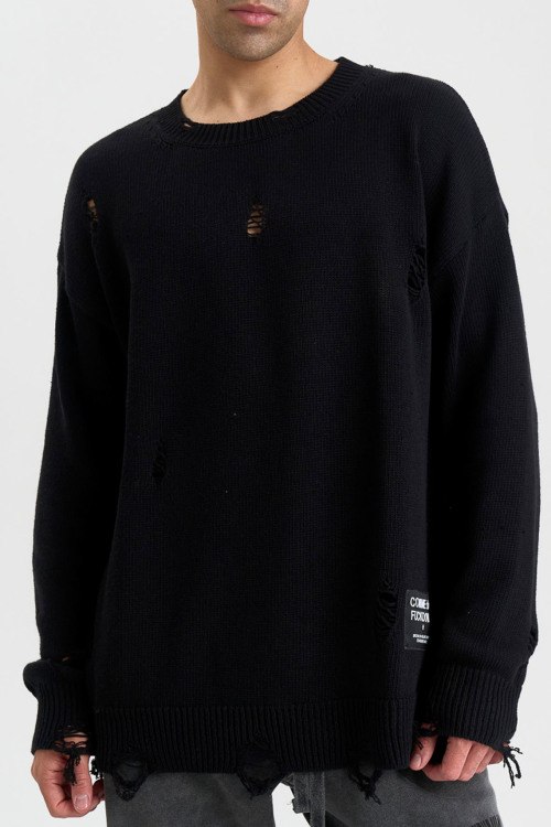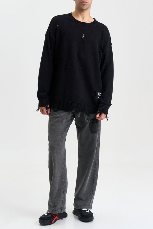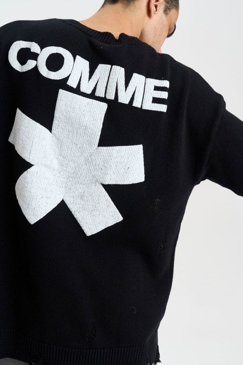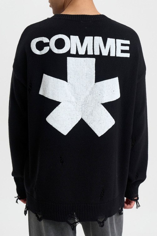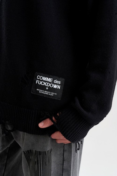 Детали: Мужской черный джемпер из хлопка и акрила от Comme des Fuckdown (Камм дес Факдаун). Дизайн с рваными деталями, логотип на спине, круглый вырез горловины, классическая длина, ребристые манжеты и нижний край. Параметры модели: 97 см - 78 см - 96 см. Рост - 188 см. Размер на фото - L
