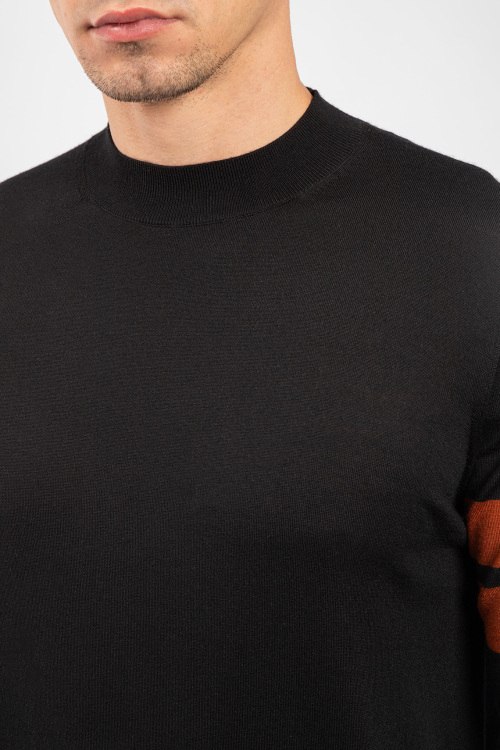 Мужской черный кашемировый джемпер от Ermenegildo Zegna (Эрменеджильдо Зенья). Контрастная вставка на рукаве, круглый вырез горловины, классическая длина, манжеты и нижний край в рубчик.