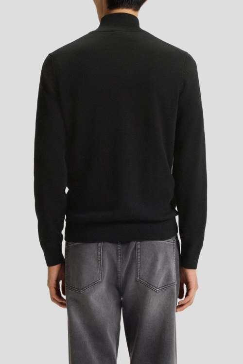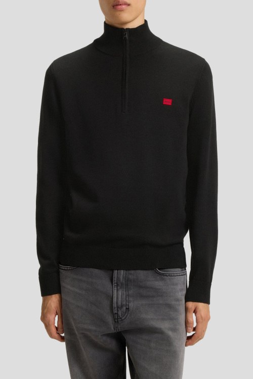 Детали: Мужской черный хлопковый джемпер San Quintus-C от Hugo by Hugo Boss (Хуго бай Хуго Босс). Логотип на груди, высокий воротник с застежкой на молнию, классическая длина, ребристые манжеты и нижний край