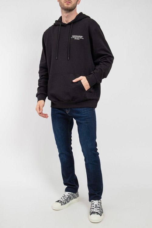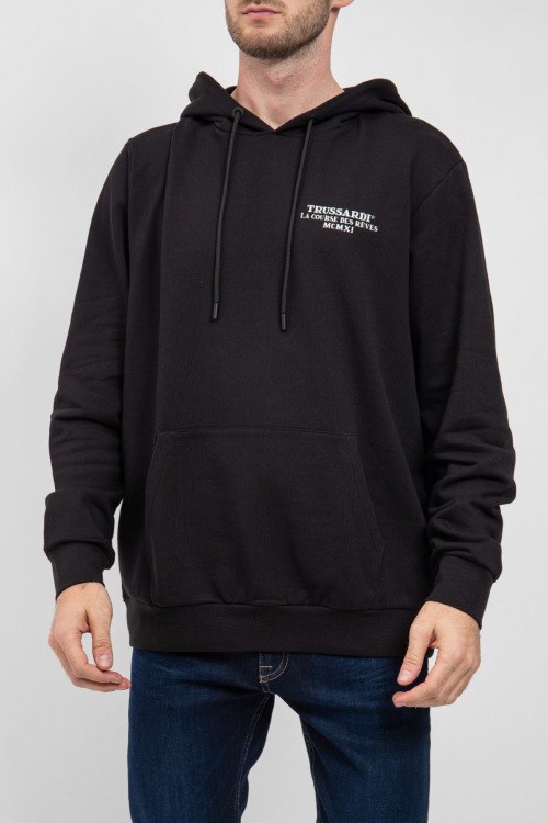 Детали: Мужской черный худи из хлопкового микса от Trussardi (Труссарди). Классическая длина, вшитый капюшон с кулиской, длинные рукава, трикотажная резинка на манжетах и по низу изделия, карман-кенгуру, принт с логотипом бренда на груди и на спине