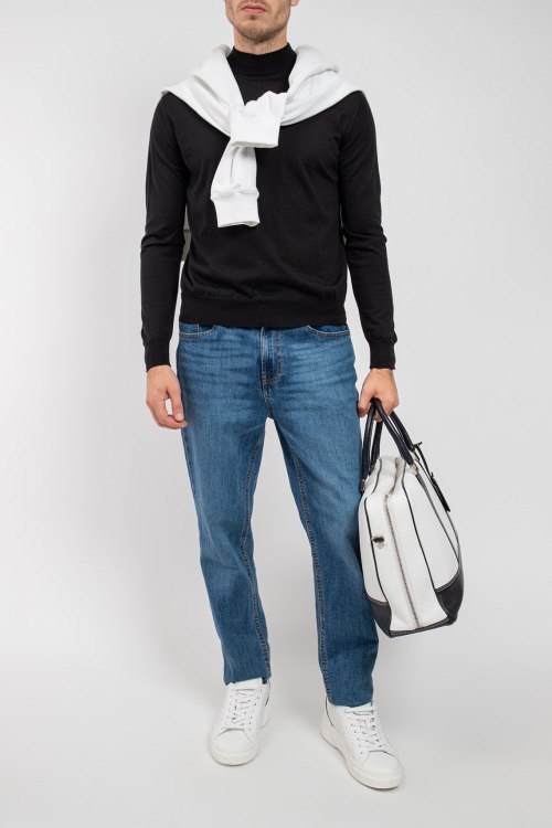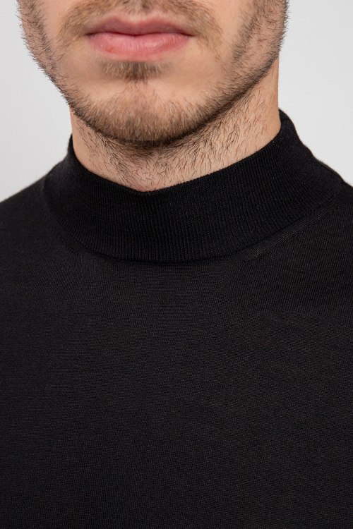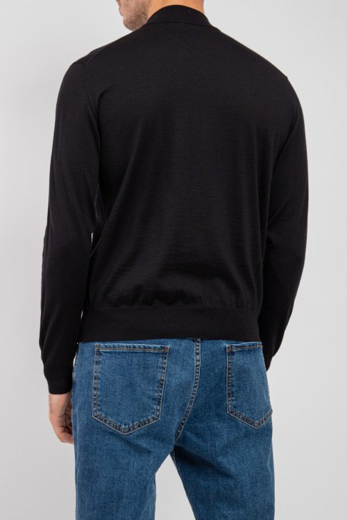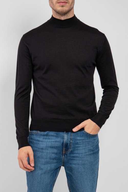 Мужской черный джемпер из шерсти и шелка от Scabal (Скабал). Воротник-стойка, классическая длина, манжеты и нижний край в рубчик.