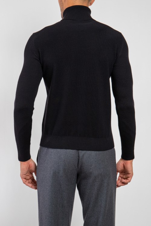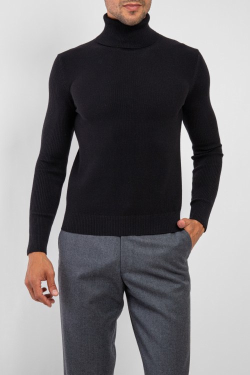 Мужской черный шерстяной гольф от Scabal (Скабал). Высокая горловина, длинный рукав в рубчик, классическая длина, нижний край в рубчик.
