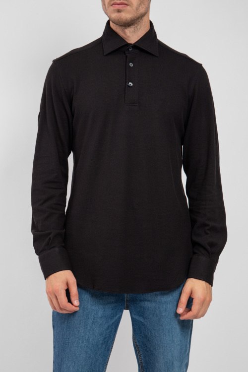Мужской черный хлопковый джемпер-поло от Scabal (Скабал). Отложной воротник, застежка на пуговицы, манжеты на пуговицах, закругленный нижний край, удлиненная длина.