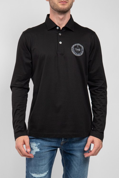 Мужской черный джемпер-поло из хлопка от Tombolini (Томболини). КЛассическая длина, отложной воротник, горловина на трех пуговицах, длинные рукава, трикотажная резинка на манжетах, вышитый логотип бренда на груди.