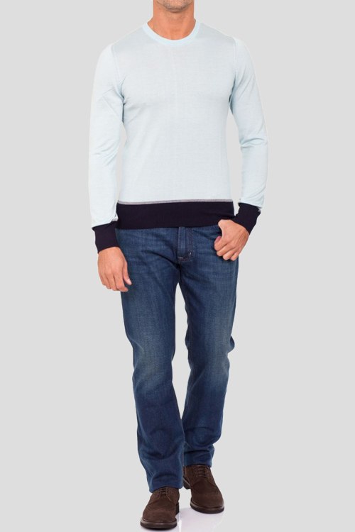 Детали: Мужской светло-голубой шерстяной джемпер от Cortigiani (Кортиджиани). Классическая модель, круглый вырез горловины, контрастные манжеты и нижний край