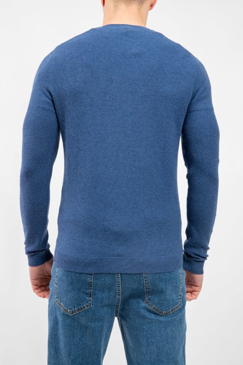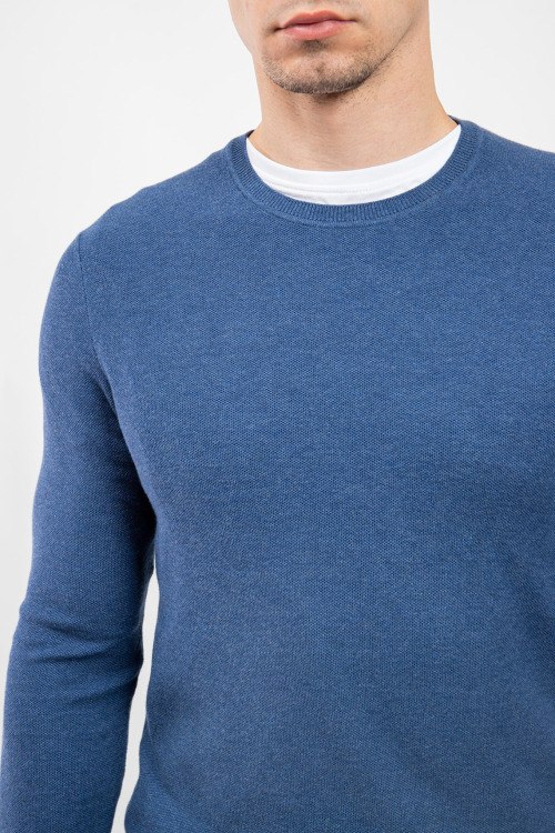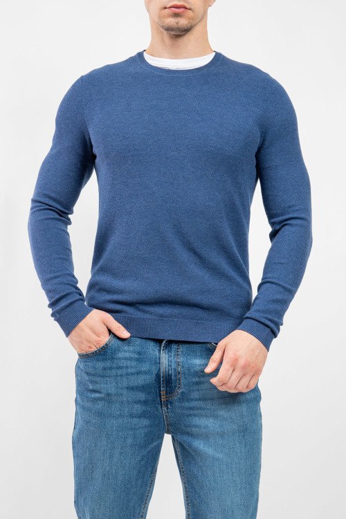 Детали: Мужской голубой джемпер из хлопкового микса от Olymp (Олимп). Классическая длина, круглый вырез горловины, длинные рукава, трикотажная резинка на манжетах и по низу изделия