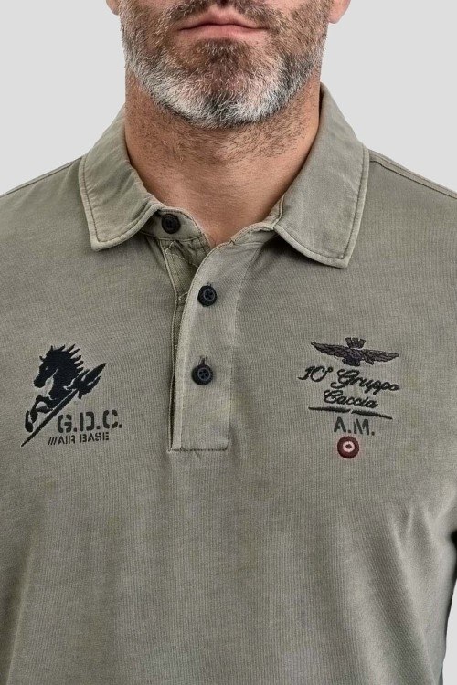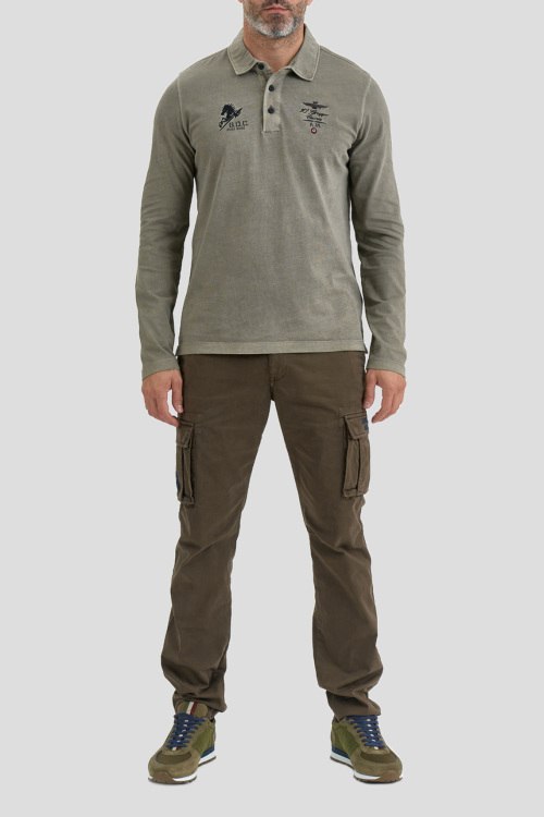 Детали: Мужской хлопковый джемпер-поло X Gruppo цвета хаки от Aeronautica Militare (Аэронавтика Милитари). Классический воротник, горловина на пуговицах, дизайн с брендированной вышивкой на груди, длинные рукава