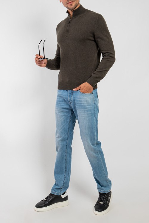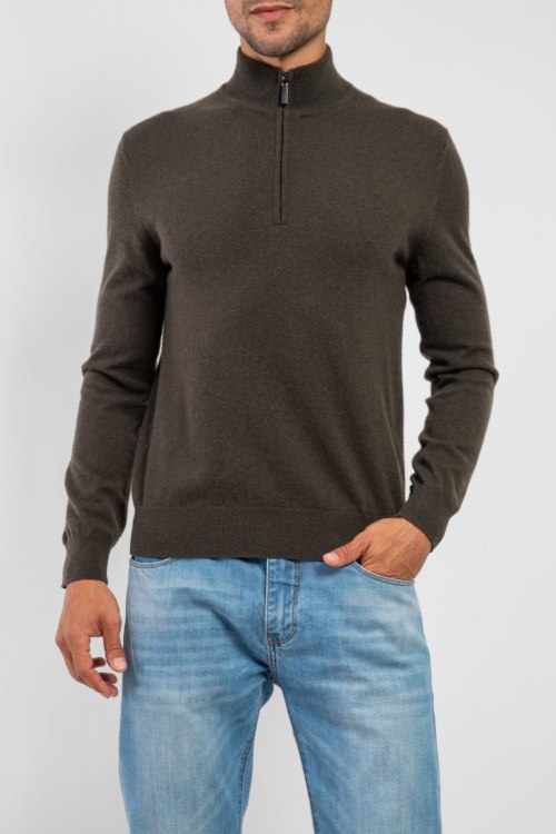 Мужской кашемировый джемпер цвета хаки от Scabal (Скабал). Высокая горловина, застежка-молния, классическая длина, манжеты и нижний край в рубчик.