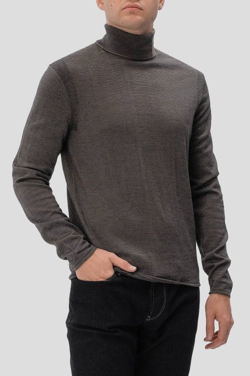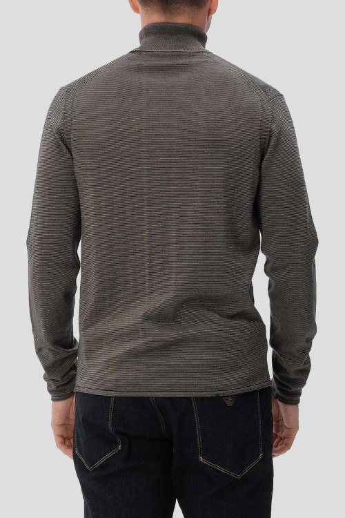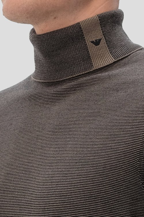 Детали: Мужской коричневый шерстяной гольф от Emporio Armani (Эмпорио Армани). Высокая горловина с логотипом, длинный рукав, классическая длина