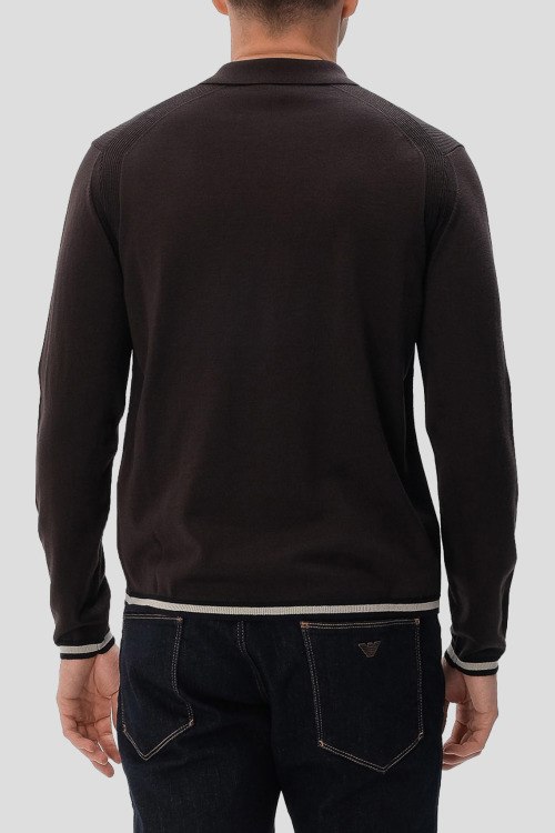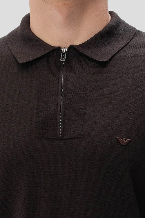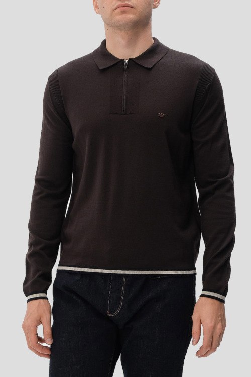 Детали: Мужской темно-коричневый шерстяной джемпер-поло от Emporio Armani (Эмпорио Армани). Логотип на груди, отложной воротник, застежка-молния, классическая длина