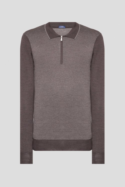 Детали: Мужской коричневый джемпер-поло из натуральной шерсти от Barba Napoli (Барба Наполи). Прямой фасон, отложной воротник, длинные рукава, застежка-молния. Замеры: длина рукава: длинный, для размера 50 - 66 см, обхват груди: для размера 50 - 104 см, обхват талии: для размера 50 - 96 см, длина изделия по среднему шву спинки от горловины: для размера 50 - 67 см