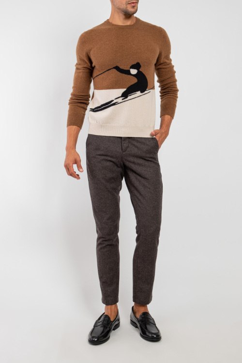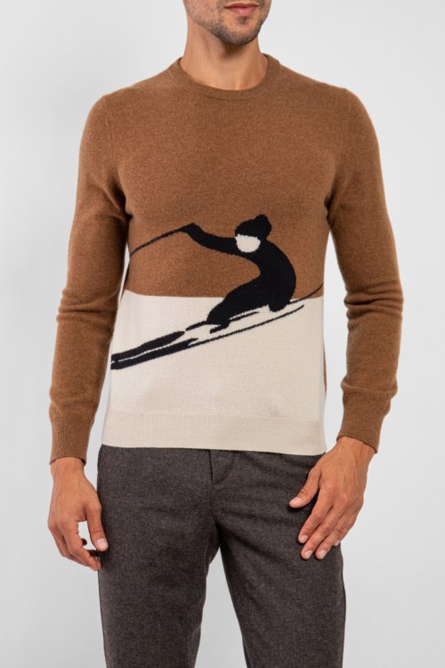 Мужской коричневый джемпер из шерсти и кашемира от Scabal (Скабал). Дизайн колор-блок, круглый вырез горловины, классическая длина, манжеты и нижний край в рубчик.