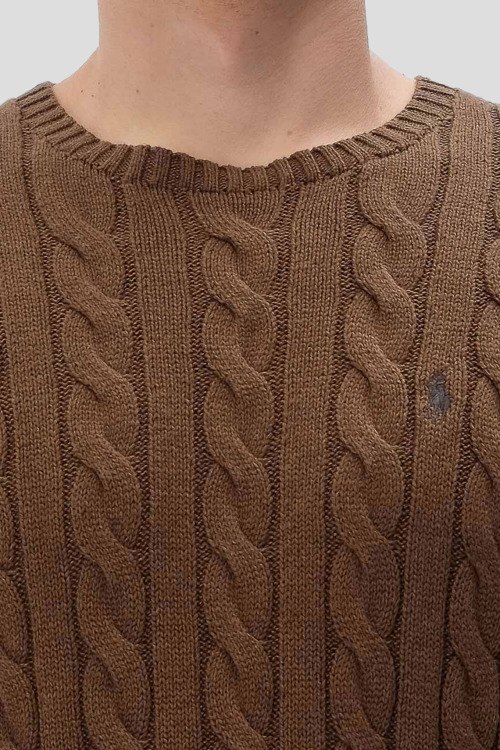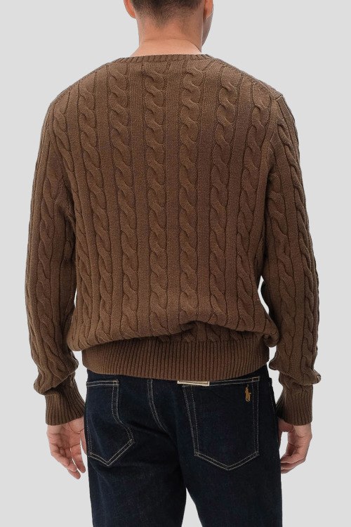 Детали: Мужской коричневый хлопковый джемпер от Polo Ralph Lauren (Поло Ральф Лорен). Фактурная вязка, логотип на груди, круглый вырез горловины, классическая длина