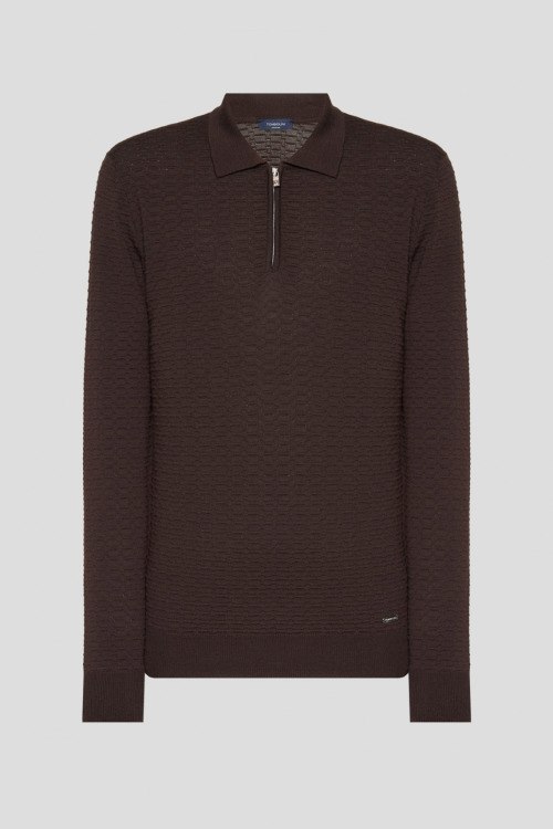 Детали: Мужской темно-коричневый шерстяной джемпер-поло от Tombolini (Томболини). Фактурная вязка, отложной воротник, застежка-молния, классическая длина. Длина рукава: длинный, для размера 50 - 65 см, обхват груди: для размера 50 - 106 см, обхват талии: для размера 50 - 106 см, длина изделия по среднему шву спинки от горловины: для размера 50 - 68 см