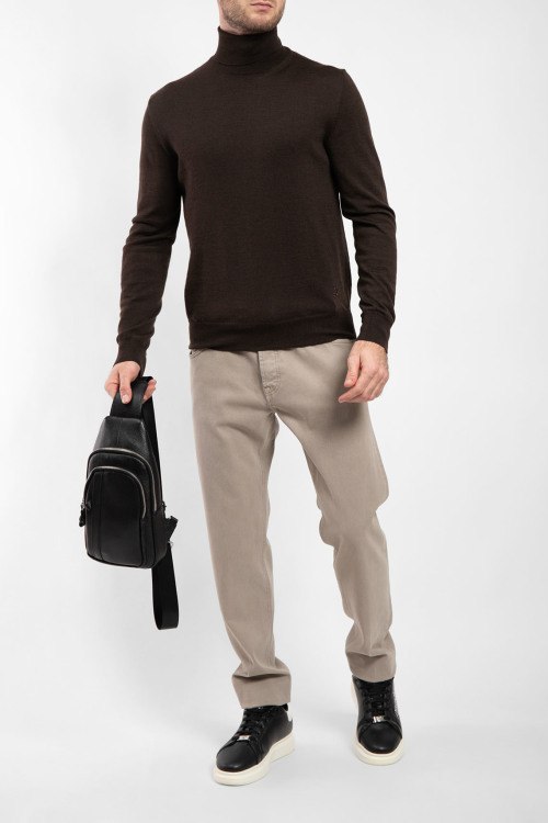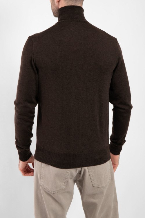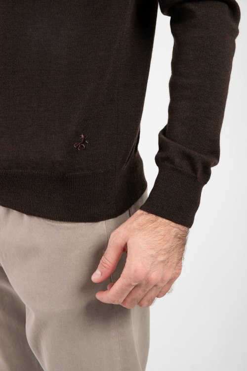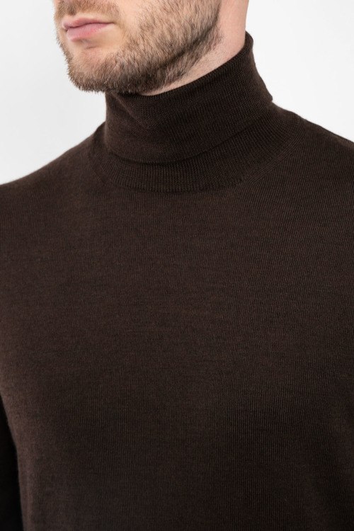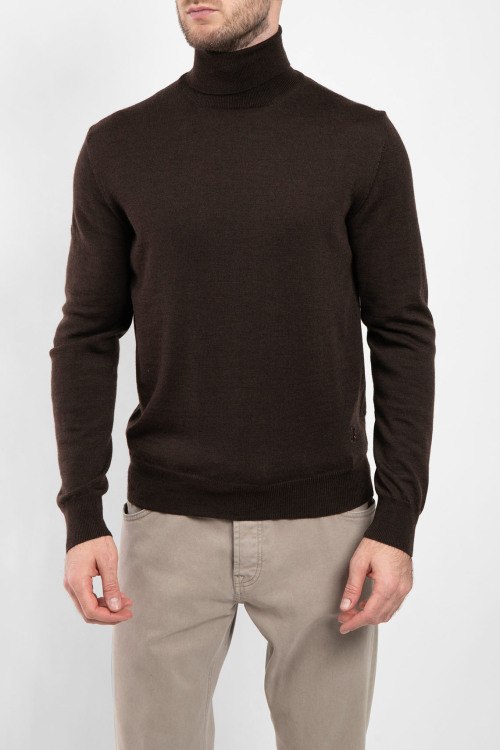 Мужской темно-коричневый шерстяной гольф от Tombolini (Томболини). Вышитый логотип, высокая горловина, классическая длина, ребристые манжеты и нижний край.