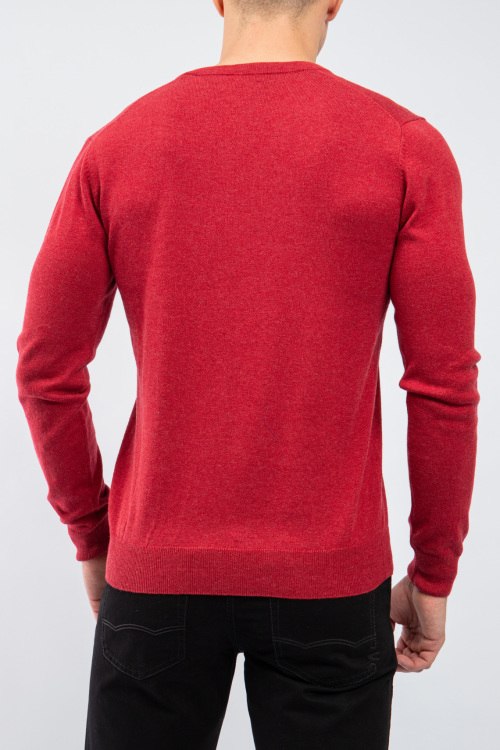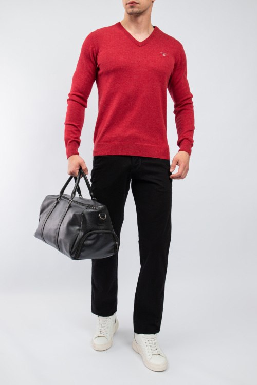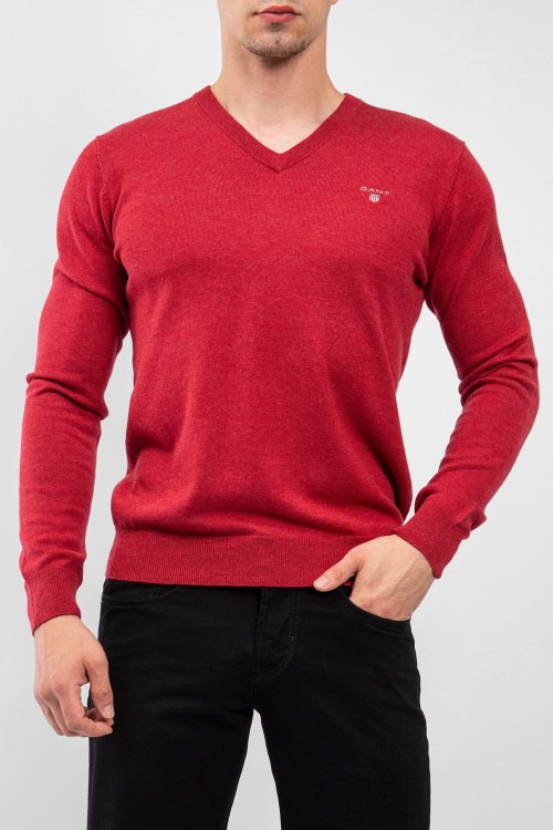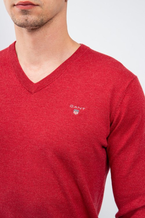 Детали: Мужской красный пуловер из хлопка и шерсти от Gant (Гант). V-образный вырез, логотип на груди, классическая длина, ребристые манжеты и нижний край
