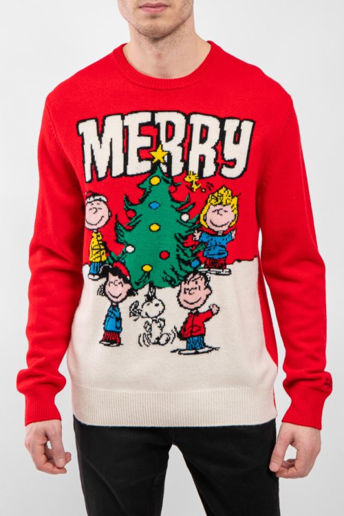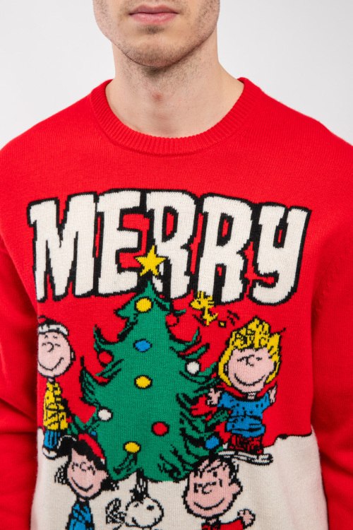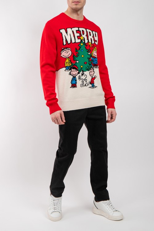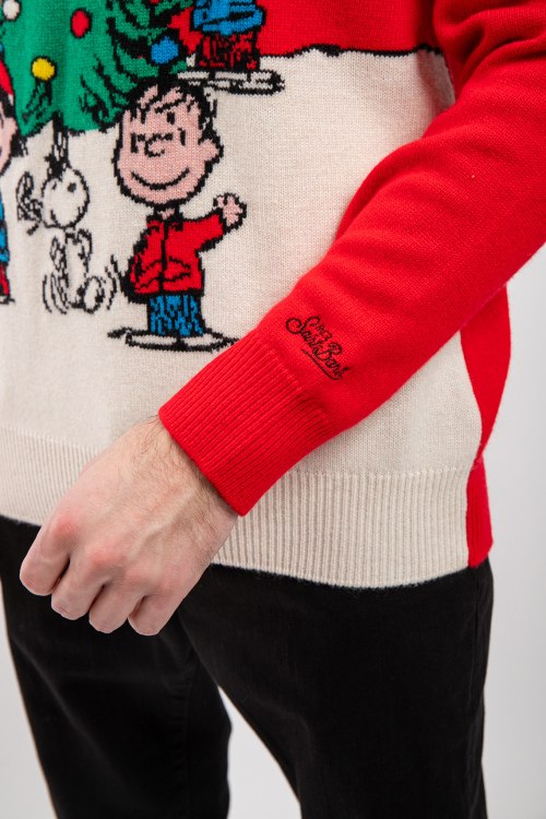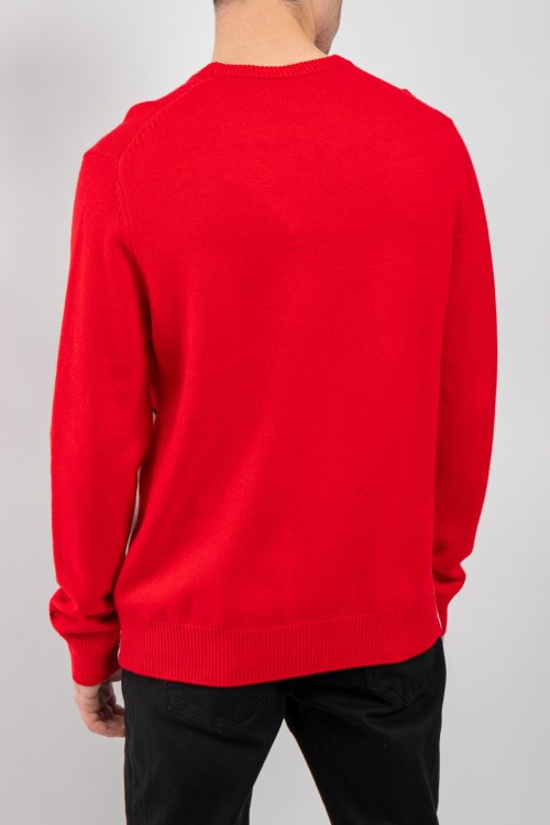Мужской красный джемпер из шерсти и вискозы Merry от Mc2 Saint Barth (Mc2 Сент Барт). Узор на груди, вышитый логотип на рукаве, круглый вырез горловины, классическая длина, манжеты и нижний край в рубчик.